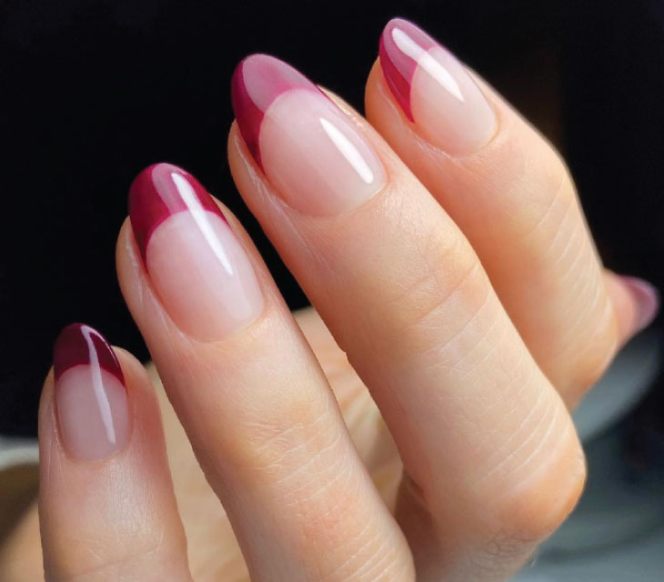 - Ένα twist στο μανικιούρ μας θα δώσουμε με το χρωματιστό γαλλικό που, όπως όλα δείχνουν, ήρθε για να μείνει. Διατηρούμε μια φυσική διάφανη απόχρωση για την επιφάνεια του νυχιού και για τη γραμμή επιλέγουμε μια φθινοπωρινή σκούρα απόχρωση, για να δημιουργήσουμε την κατάλληλη αντίθεση.