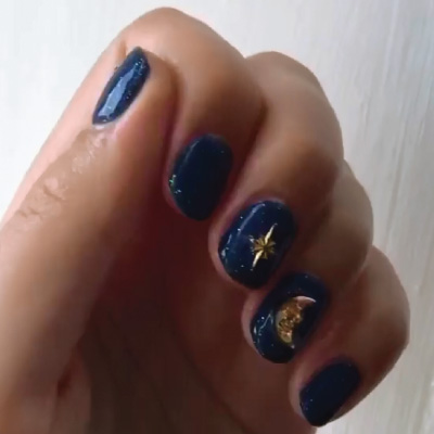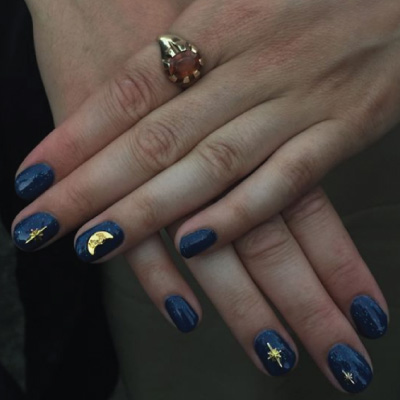 Αυτό το μαγευτικό και μυστηριώδες μανικιούρ έγινε, χρησιμοποιώντας το CND Shellac Winter nights, το CND Shellac Glitter Top Coat και χρυσά διακοσμητικά πετράδια σε σχήμα μισοφέγγαρου ή αστεριού!