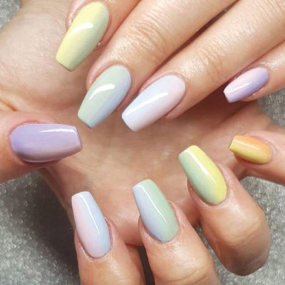 Στο μανικιούρ της φωτογραφίας βλέπουμε νύχια με επέκταση χρησιμοποιώντας CND Retention+ ακρυλικά προϊόντα, και αγαπημένες καλοκαιρινές αποχρώσεις που δίνουν ένα φωτεινό αποτέλεσμα.