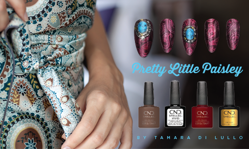 3) Εφαρμόστε μια λεπτή στρώση CND™ SHELLAC™ Decadence για να δημιουργήσετε ένα μοτίβο σε σκούρο τόνο του κρασιού - πολυμερίστε για 60 δευτερόλεπτα.