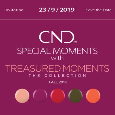 Με μεγάλη χαρά σας προσκαλούμε στο CND Seasonal Trend Class "Treasured Moments", που θα γίνει στην αίθουσα εκδηλώσεων της Creative Group στα Σπάτα, τη Δευτέρα 23/09! Θα παρακολουθήσετε μια αναλυτική παρουσίαση των ολοκαίνουργιων αποχρώσεων της CND, κατά την οποία επίσης θα δείτε την εφαρμογή 4 πρωτοποριακών σχεδίων nail art με τις φθινοπωρινές αποχρώσεις CND Shellac & CND Vinylux και θα ενημερωθείτε για όλα τα nail & fashion trends για το Φθινόπωρο 2019!