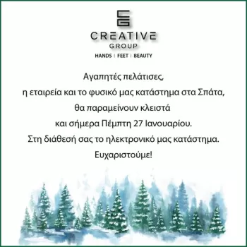 Θα θέλαμε να σας ενημερώσουμε πως η εταιρεία μας θα παραμείνει κλειστή για τις καθιερωμένες καλοκαιρινές διακοπές από 15 έως 21 Αυγούστου . Ραντεβού ξανά στις 22 Αυγούστου! Η ομάδα της Creative Group σας εύχεται ένα ξέγνοιαστο και δροσερό καλοκαίρι!!! Ευχόμαστε να περάσετε ευχάριστα το υπόλοιπο των καλοκαιρινών σας διακοπών, να ξεκουραστείτε...