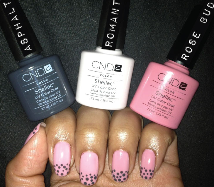Οι αποχρώσεις που συνδυάσαμε είναι ιδανικές για αυτού του είδους το μανικιούρ, και είναι το CND Shellac Asphalt (το διαχρονικό γκρι της ασφάλτου), το CND Shellac Romantique (το δημοφιλές απαλό ροζ γαλακτερό) & το CND Shellac Rosebud (το κλασικό βαθύ ροζ).