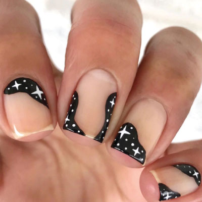 Μπορεί να φαίνεται ιδιαίτερα "καλλιτεχνικό" nail art, αλλά είναι πολύ πιο εύκολο να το δημιουργήσετε από όσο νομίζετε! Σχεδιάστε μαύρες γραμμές και χρωματίστε τις με μαύρο βερνίκι νυχιών, και στη συνέχεια δημιουργήστε τα λευκά άστρα με σφραγίδα ή ζωγραφίστε τα στο χέρι!