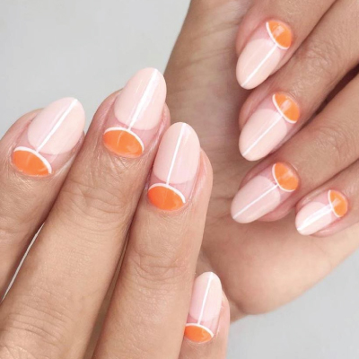 Το έντονο πορτοκαλί Electric orange προτιμήθηκε για το πίσω μισοφέγγαρο, ώστε να δώσει μια ένταση και, την καθαρότητα του μανικιούρ μας την πετυχαίνουμε με την αγαπημένη απόχρωση Uncovered.