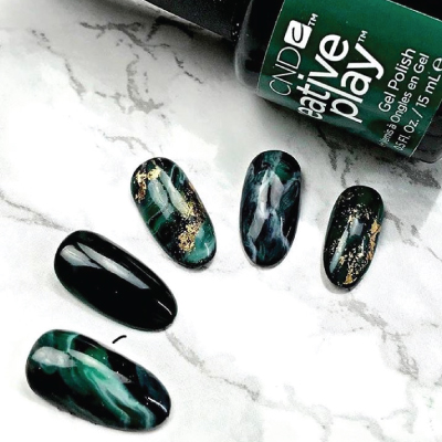 Με την τεχνική one stroke και τα ημιμόνιμα βερνίκια της CND, Creative play gel polish, έχουμε μανικιούρ με εφέ μαρμάρου σε υπέροχο συνδυασμό χρωμάτων και glamorous όψη.