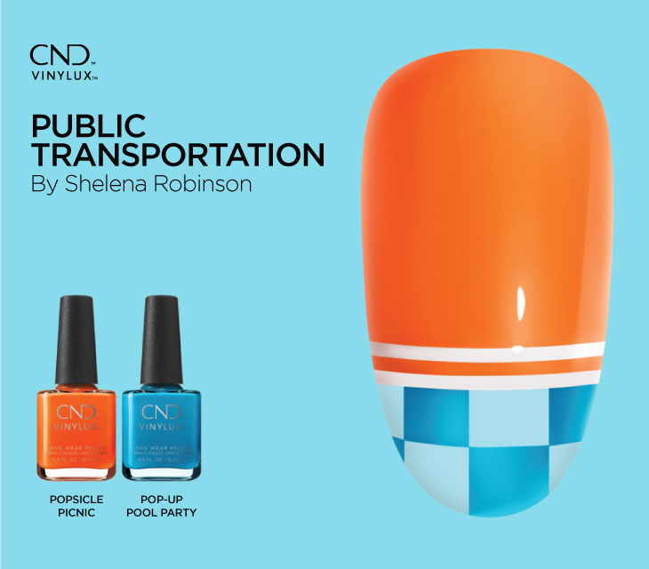 Καλοκαιρινό σχέδιο νυχιών με την ονομασία "Public Transportation", με αποχρώσεις βερνικιού μακράς διάρκειας CND Vinylux από την ολοκαίνουργια συλλογή βερνικιών νυχιών "Summer City Chic" της CND για τo Καλοκαίρι του 2021!