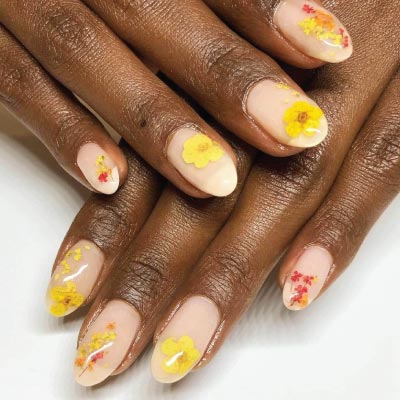 Η εφαρμογή των αποξηραμένων λουλουδιών προτείνεται συνήθως σε ημιμόνιμο ή μόνιμο μανικιούρ έτσι ώστε να μπορέσουμε να τα τοποθετήσουμε απευθείας μετά το χρώμα πάνω στην κολλήδη ουσία.