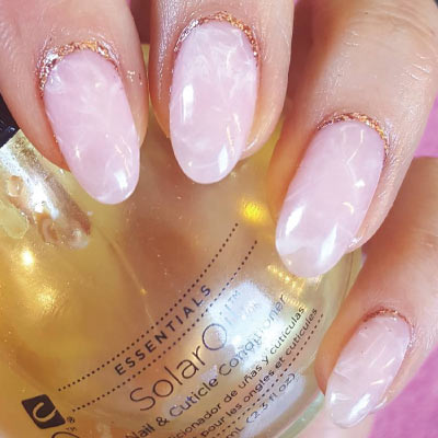 Μπορείτε επίσης να πειραματιστείτε με ένα άλλο μεγάλο trend της εποχής: το "cuticle couture". Αφού δημιουργήσετε το σχέδιο rose quartz, σχεδιάστε μια πολύ λεπτή γραμμή με χρυσό glitter γύρω από το επωνύχιο, για μια glam πινελιά!