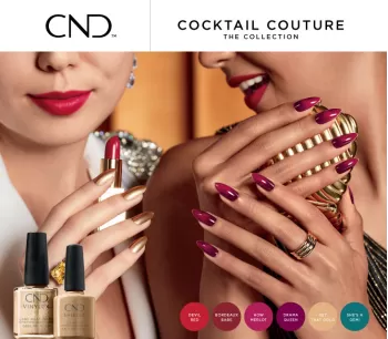 Η CND σας προσκαλεί να γιορτάσετε με στιλ, με τις πιο πολυτελείς αποχρώσεις νυχιών αυτής της σεζόν! Κάνετε πρόποση αυτές τις γιορτές με την Cocktail Couture , μια συλλογή από αποχρώσεις νυχιών βαθιές κόκκινες και μωβ, πλούσιες χρυσές και μια εκλεπτυσμένη πράσινη, για ένα πολυτελές και κομψό look. Διαθέσιμη σε CND SHELLAC Brand Gel Polish...