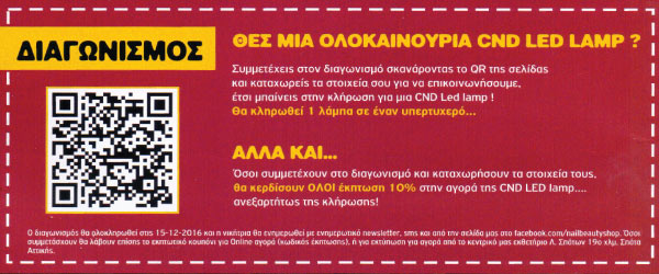 Επισκεφθείτε το περίπτερο του Creative Group (#304, Κτίριο Γ) και αναζητήστε το έντυπο φυλλάδιο με τα νέα χρωματολόγια της CND. Στην προτελευταία σελίδα, θα βρείτε το παρακάτω κουπόνι. Δηλώστε συμμετοχή στο διαγωνισμό μας, σκανάροντας το QR και καταχωρώντας τα στοιχεία σας στη σελίδα που θα μεταφερθείτε (ή πατήστε απευθείας εδώ).