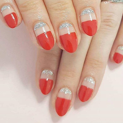 Χωρίζοντας το νύχι ουσιαστικά σε δύο μέρη, έχουμε από το μέσο και προς τα πίσω ως βάση το διακριτικό ημιδιάφανο μπεζ, Powder my nose και μεσοφέγγαρο στο επωνύχιο ασημί glitter, και στο υπόλοιπο μισό μέχρι και όλο το ελεύθερο άκρο το φλογερό Wildfire.