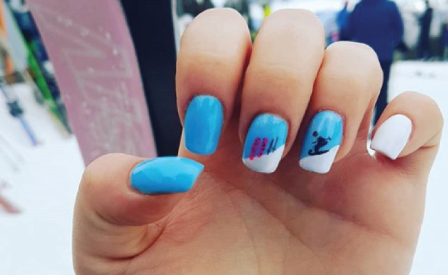 Για να επιτύχετε το look, λιμάρετε τα νύχια σε ένα κοντό, στρογγυλό ή στρογγυλεμένο τετράγωνο σχήμα. Στη συνέχεια, χρησιμοποιώντας μια ταινία (striping tape) και λίγο μπλε και λευκό βερνίκι, δημιουργήστε προσεκτικά τη σιλουέτα μιας βουνοπλαγιάς. Προσθέστε μερικά γραφικά εμπνευσμένα από το σκι, για ένα ολοκληρωμένο look που θα λάτρευε οποιοσδήποτε ταξιδιώτης!