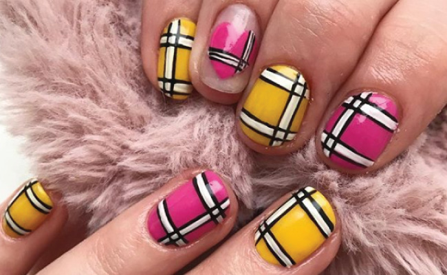 Λιμάρετε τα νύχια σε ένα κοντό, στρογγυλό σχήμα, και μετά προσθέστε λίγο έντονο χρώμα εναλλάσσοντας φούξια και κίτρινο χρώμα βερνικιού σε κάθε νύχι. Χρησιμοποιήστε προσεκτικά ένα μικρό πινέλο και λίγο μαύρο και άσπρο χρώμα για να δημιουργήσετε αυτό το εμβληματικό καρό μοτίβο. Ολοκληρώστε το look με ένα γυαλιστικό top coat.