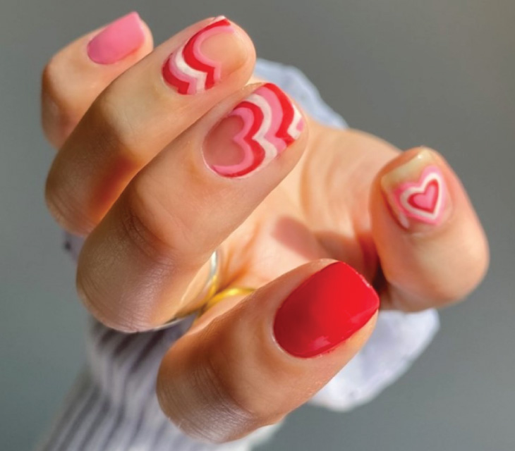 Φυσικά, όταν λέμε ότι το κόκκινο είναι μια σταθερή επιλογή, αυτό δεν σημαίνει ότι πρέπει να επιμείνετε σε μια μόνο συγκεκριμένη απόχρωση όταν κάνετε τα νύχια σας για την Ημέρα του Αγίου Βαλεντίνου! Δοκιμάστε να εφαρμόσετε αυτό το κόκκινο χρώμα σε σχήματα καρδιάς ή σαν γραμμή γαλλικού - και όσο το κάνετε αυτό, ενσωματώστε και μερικά άλλα χρώματα νυχιών που σχετίζονται με τον ρομαντισμό, όπως ροζ, ή ακόμα και μαύρο!